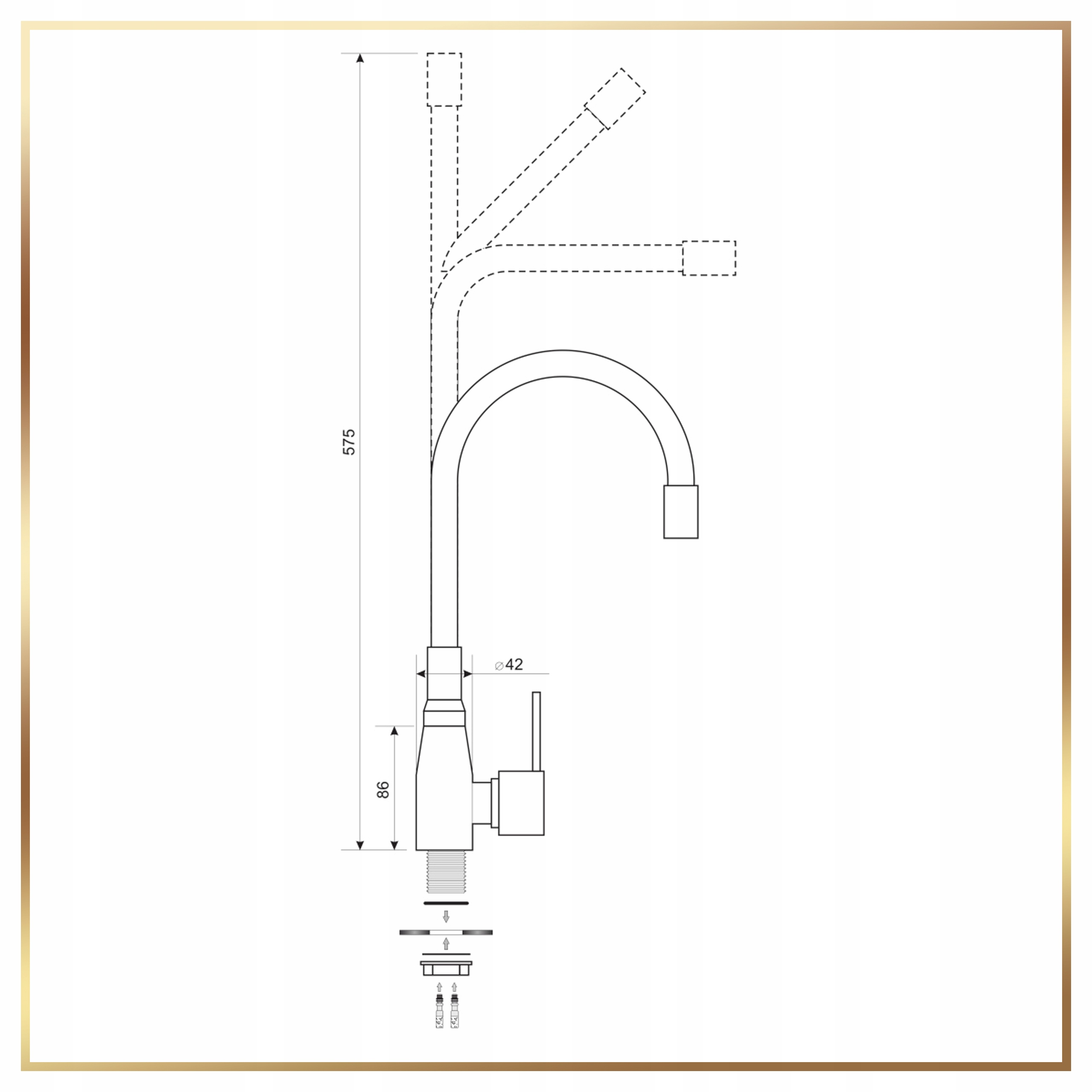 ✅ Bateria jest wyposażona w zestaw 2 wężyków podłączeniowych o średnicy 3/8 cala i długości 35 cm, mocowanie oraz uszczelki.