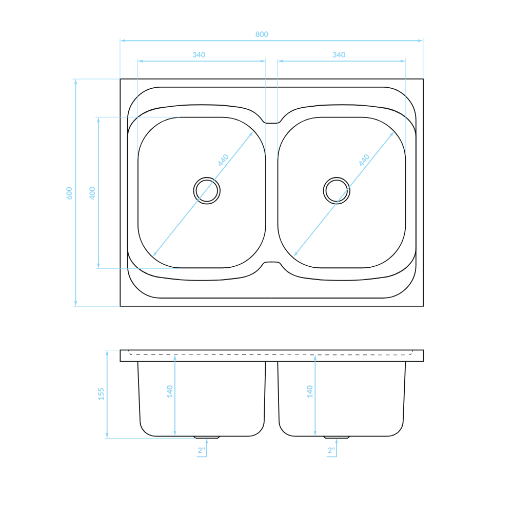 ✅2 x 2" , przelew i wyjście na zmywarkę.