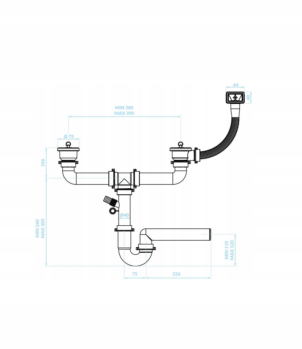 ✅ Syfon z metalowym sitkiem wykonanym ze stali nierdzewnej i z wyjściem na zmywarkę