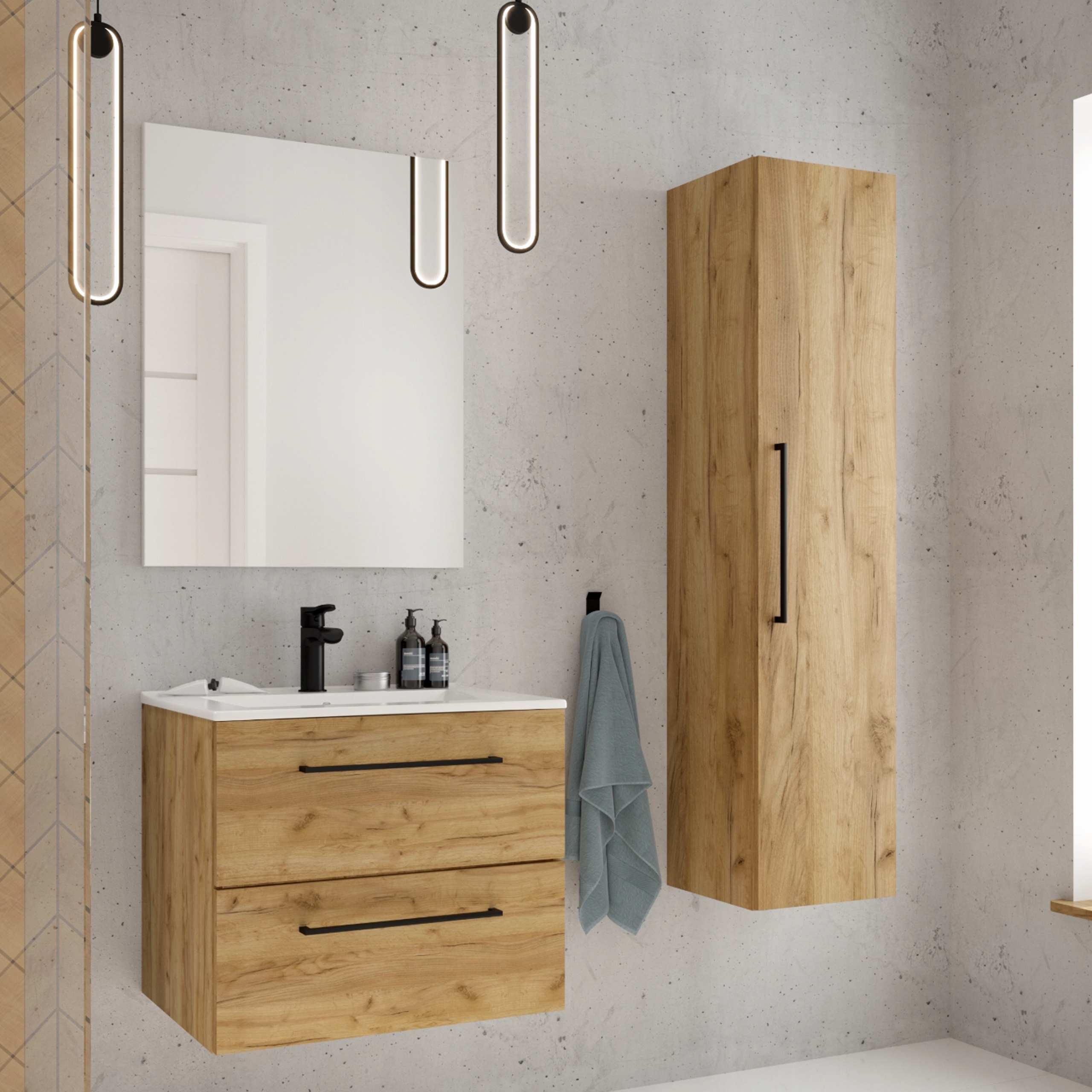 Szafka podumywalkowa w kolorze dąb craft złoty dodaje wnętrzu stylu i ciepła, idealnie komponując się z nowoczesnymi oraz klasycznymi aranżacjami łazienek.