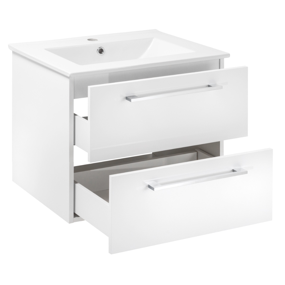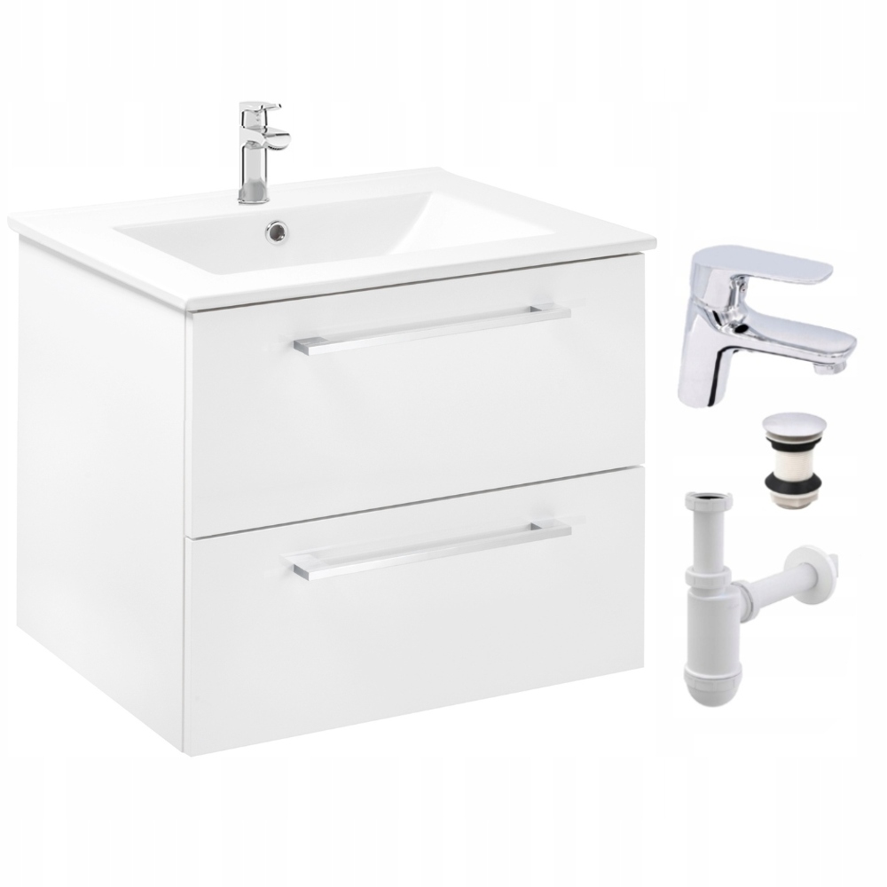 Szafka Łazienkowa z Umywalką 60 x 47 cm Biała Połysk Szuflady Bateria Chrom