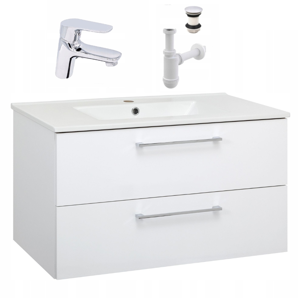 Szafka Łazienkowa z Umywalką 80 x 47 cm Wisząca Biała Połysk Bateria Chrom