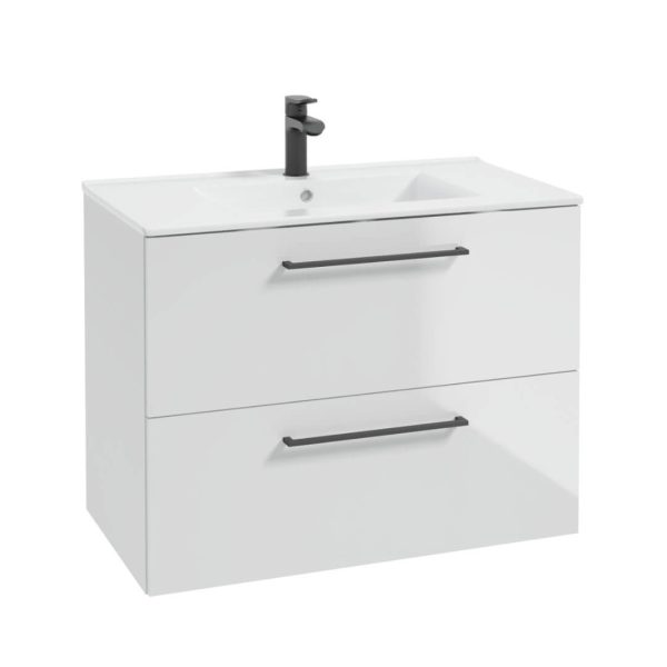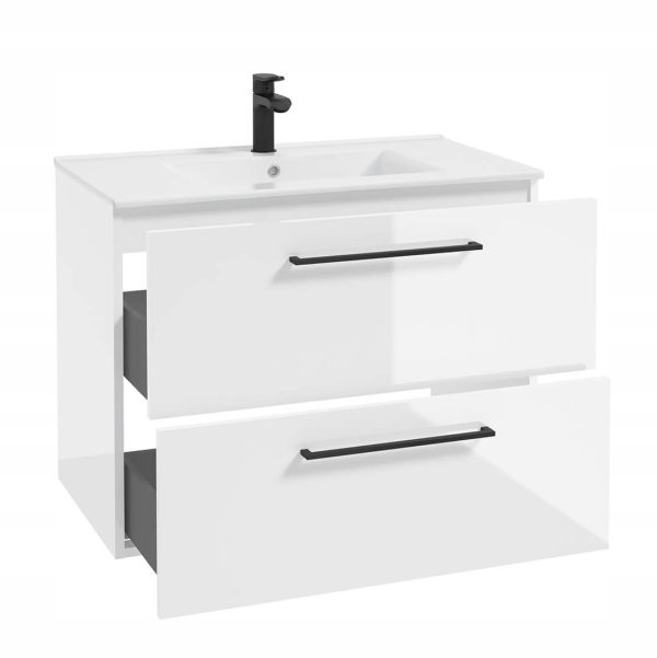 Szafka Łazienkowa z Umywalką Biała Połysk 80 x 47 cm Wisząca Uchwyty Czarne