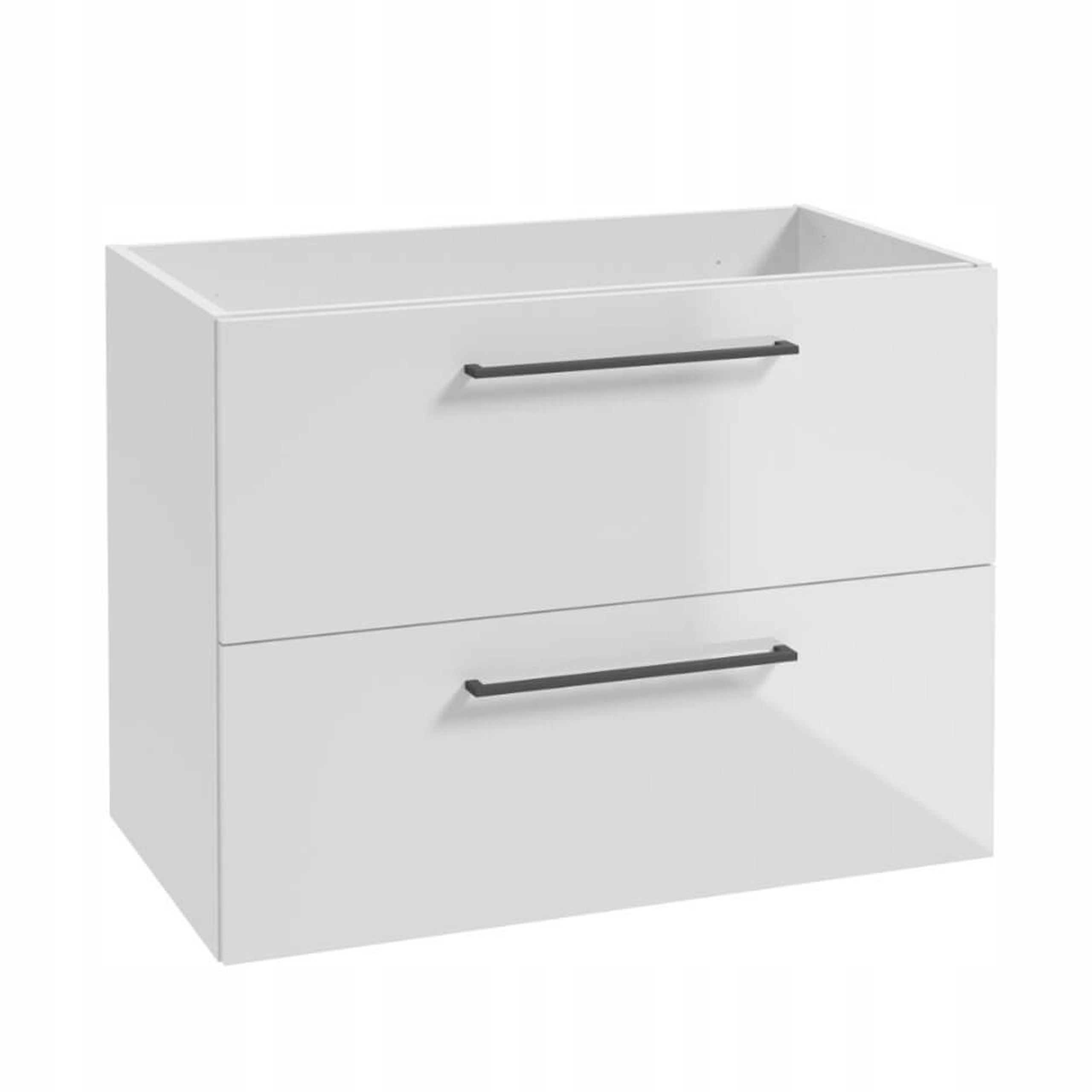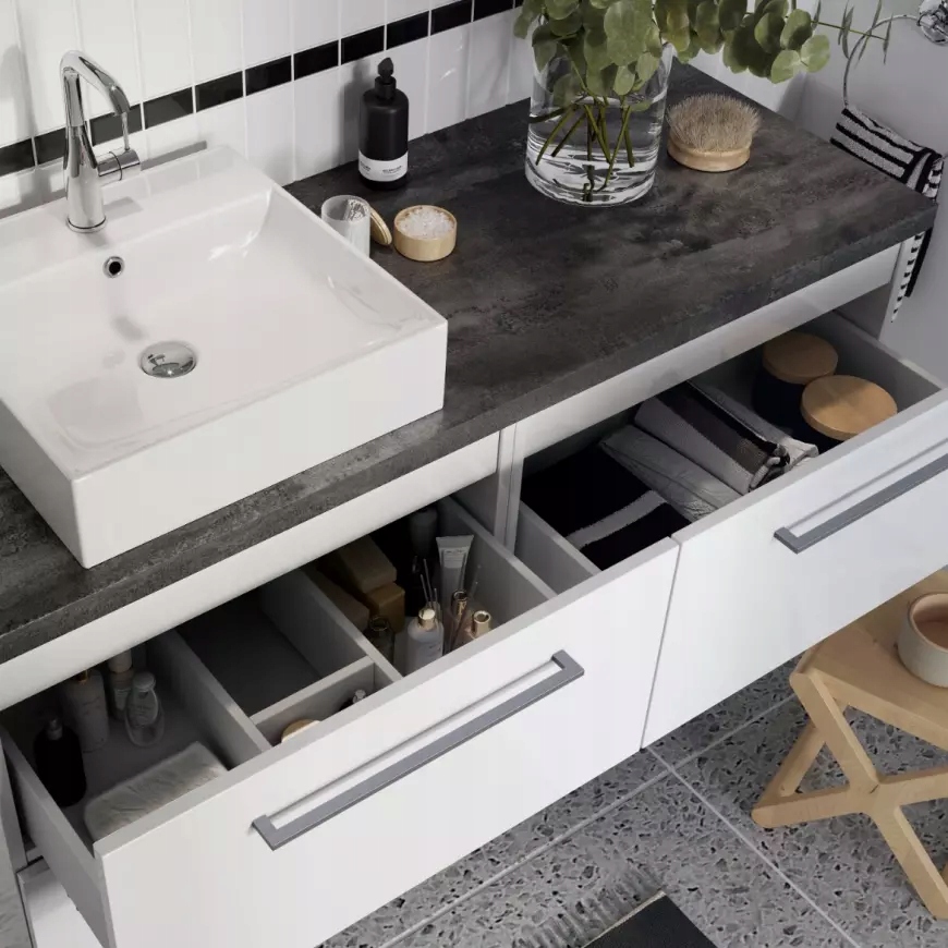 ✅ Wisząca szafka pod blat z dwiema szufladami wyposażonymi w system soft close. Front i korpus pokryte są światłoutwardzalnym lakierem, są trwalsze i bardziej odporne na wilgoć. Metalowe, chromowane uchwyty podkreślaja geometryczną linię szafki.
