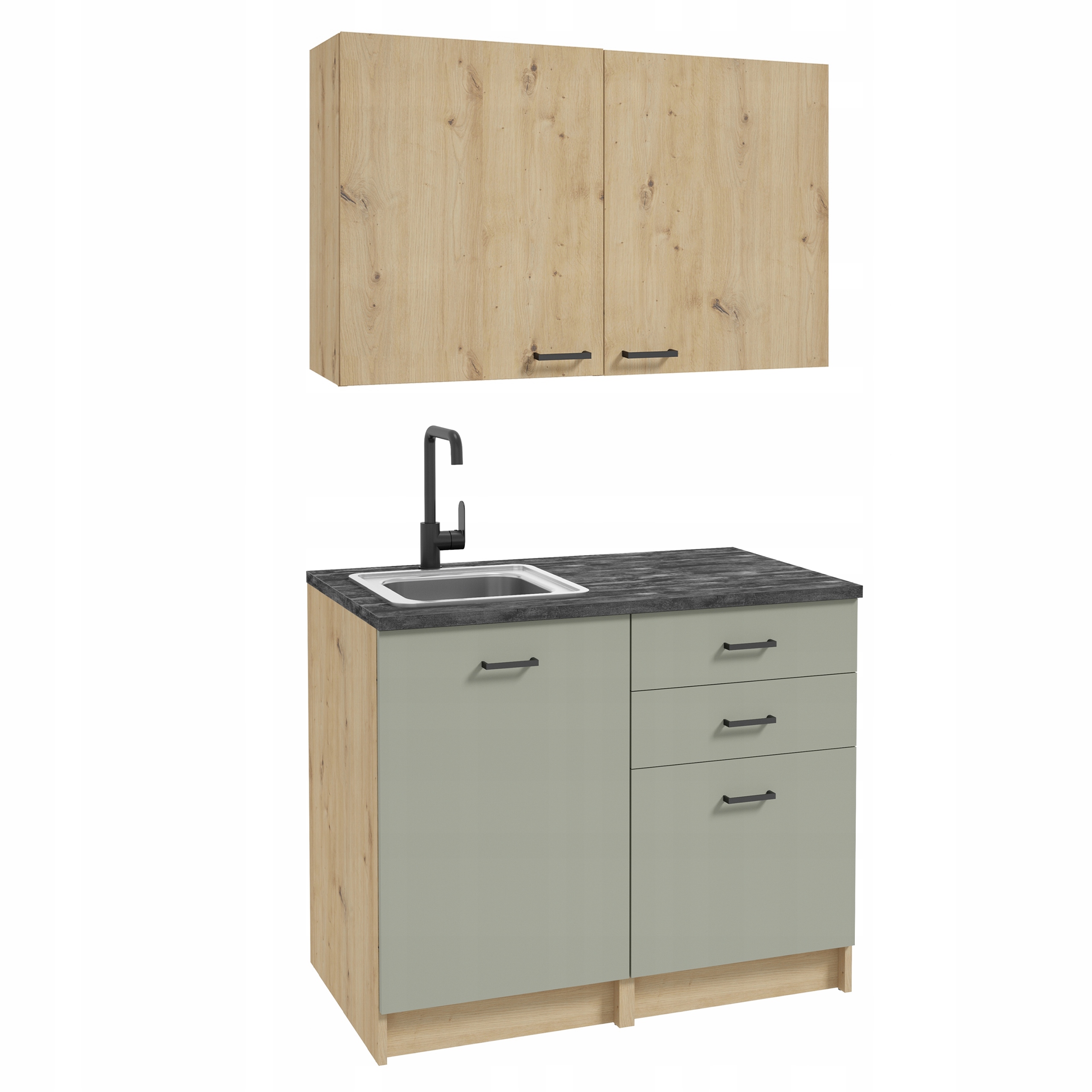 Zestaw Szafek do Kuchni 100x60cm Dąb Artisan/Zielony +Blat Czarny + Wisząca